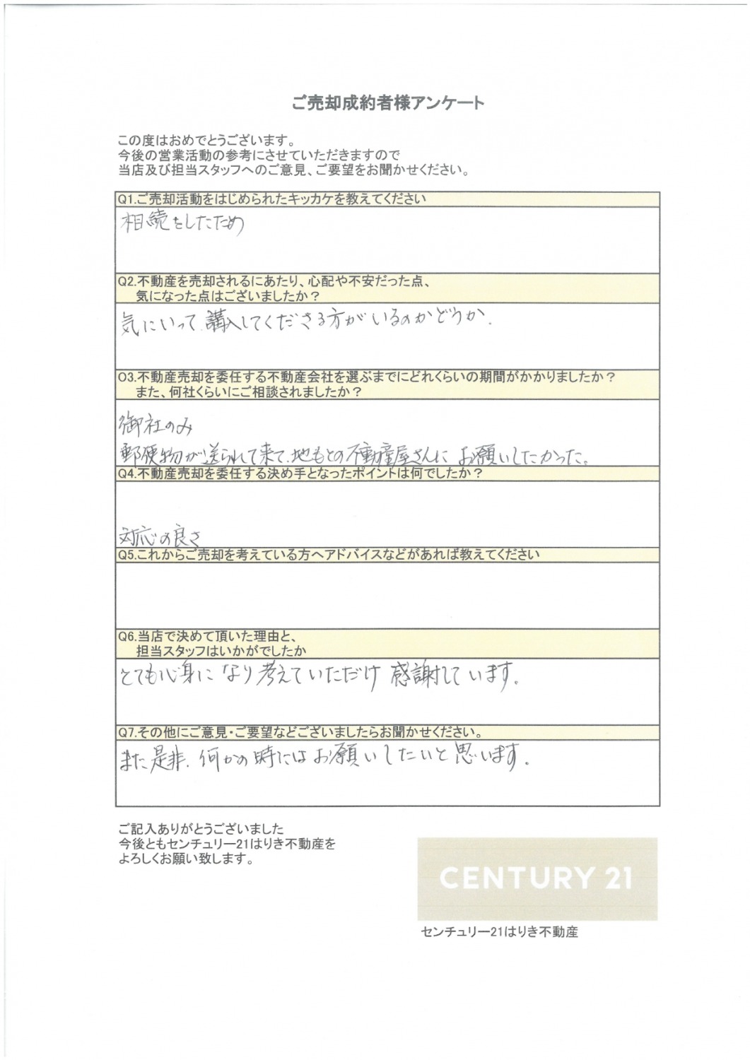 葛飾区にお住いのU様 アンケートを見る とても親身になり考えて頂け感謝しています。 この度はご成約誠におめでとうございます。 弊社へ売却委任を頂いてから、約3か月でのお引渡しとなりました。 特殊な物件でしたので、探り探りでのご売却活動でしたが無事にご成約できたこと嬉しく思っております。 またなにかございましたら、いつでもご相談くださいませ。 担当土田 優太